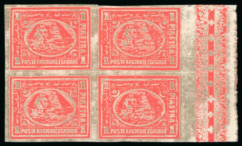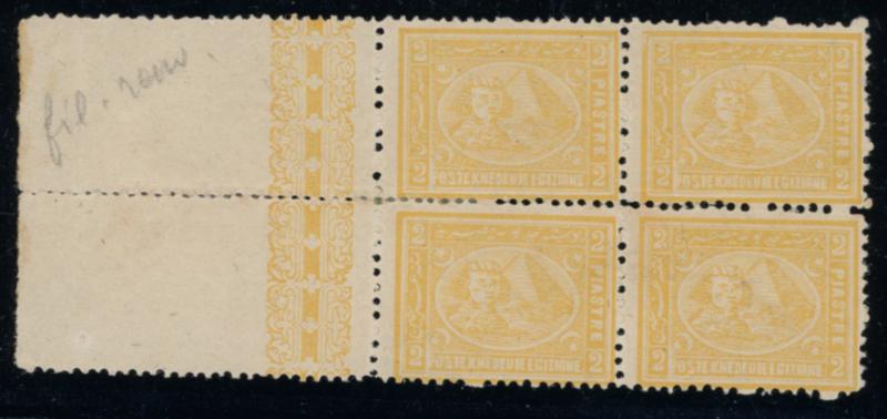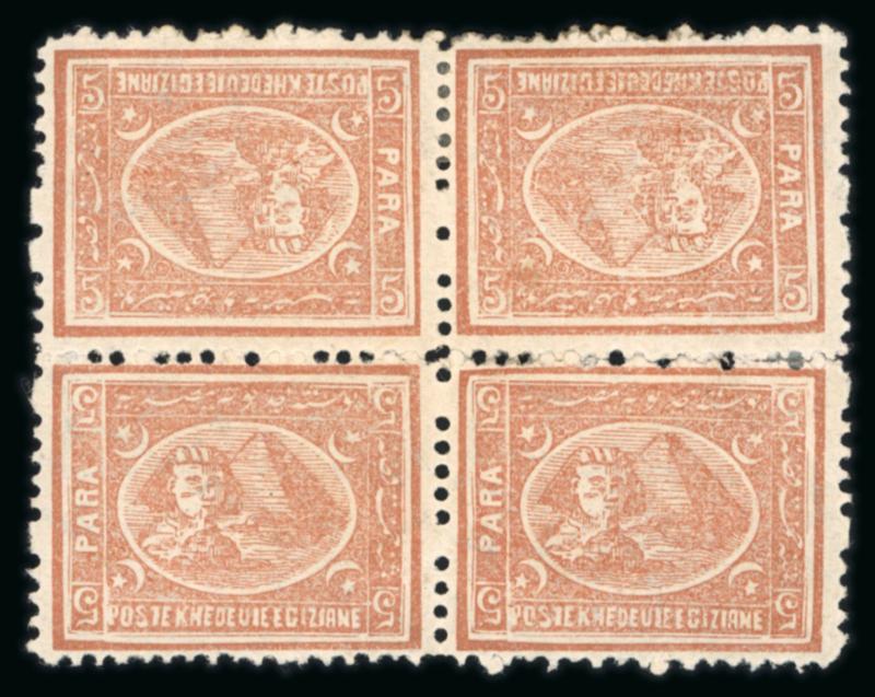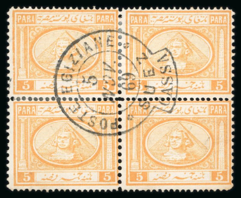 5pa Orange yellow, used rejoined block of four, showing stunning central POSTE EGIZIANE/SUEZ/CASSA "key-hole" cds, fresh, very fine, and a scarce used multiple; ex Lars Alund (NP D8, $175) (Image)