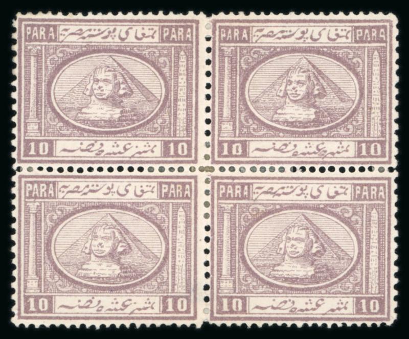 10pa Lilac, mint block of four, top left stamp shows "extra Arabic letter" plate flaw, heavy hinge remains, very fine and a scarce unused block with the plate variety; ex Peter Smith. (Image)