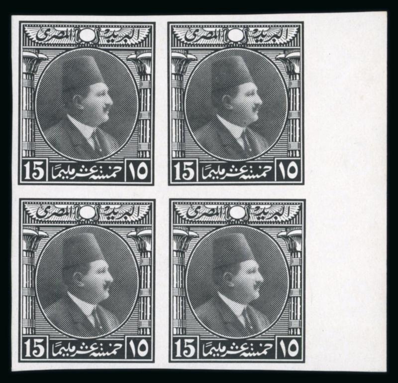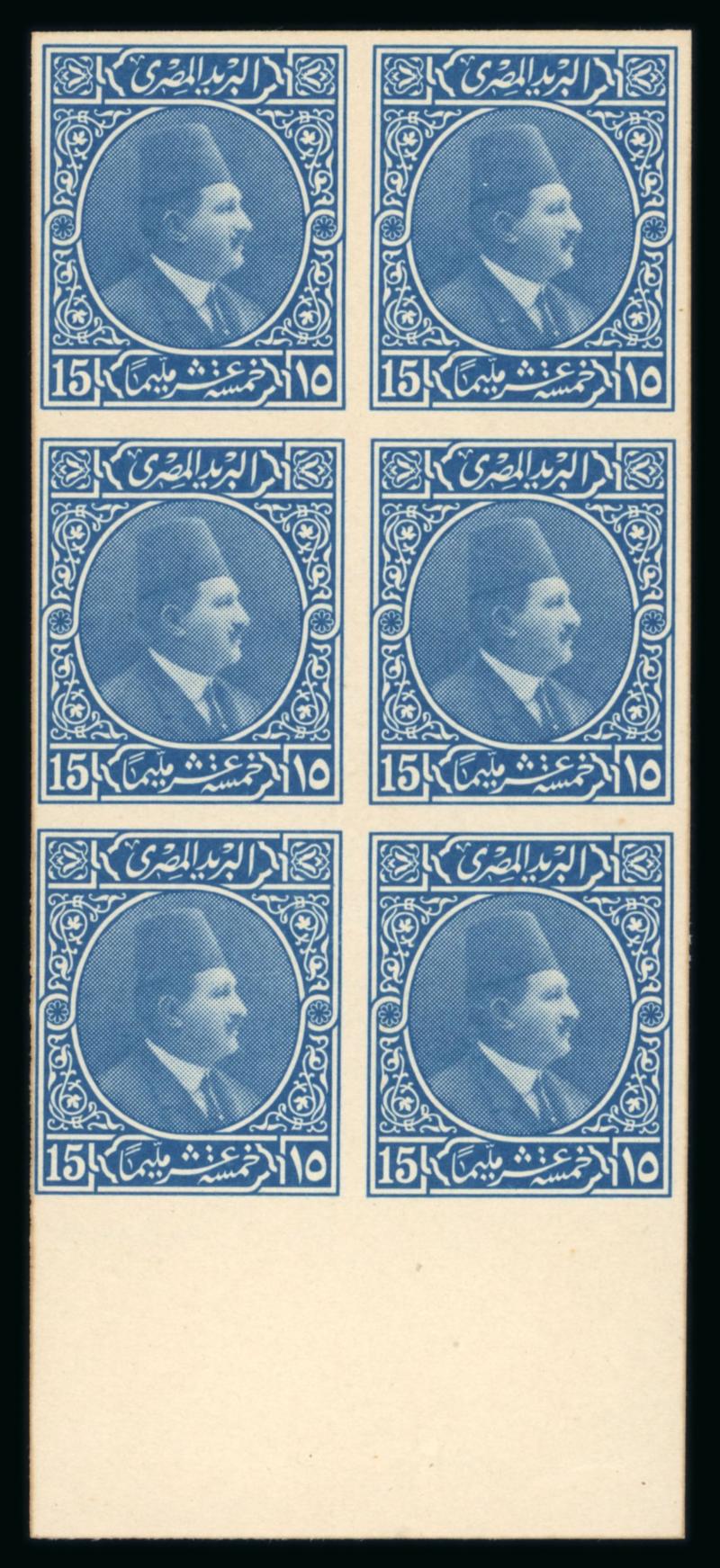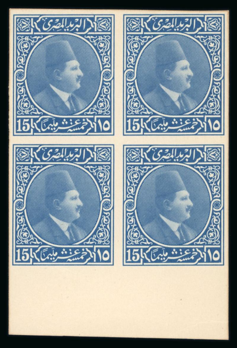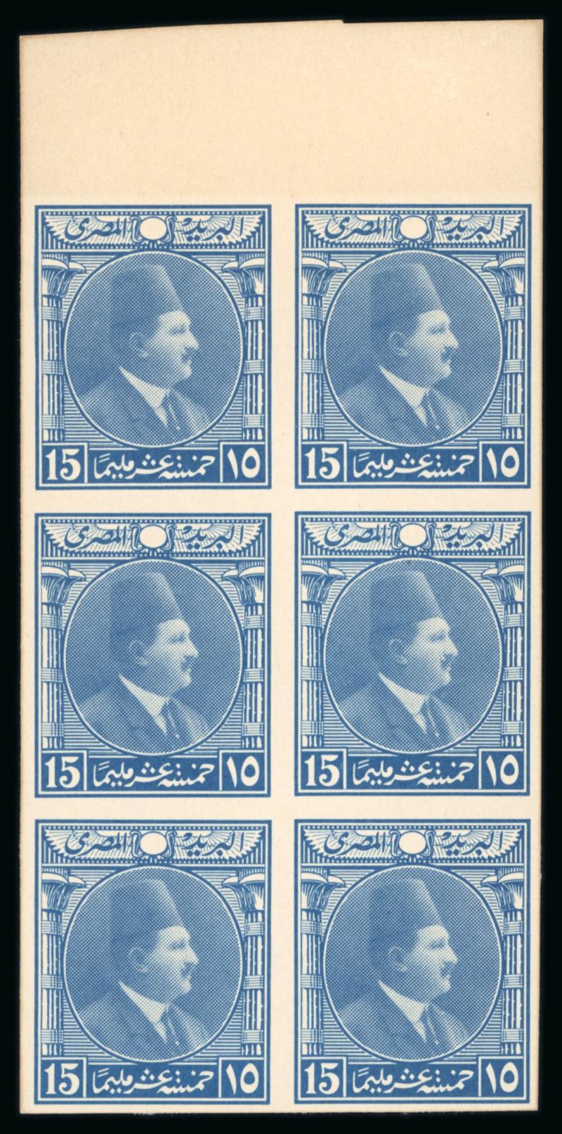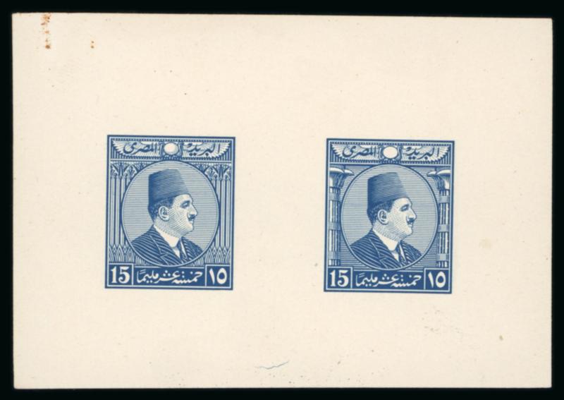 1922 Essays by the Survey Department of Egypt, Cairo: 15m Blue, small format, vignette depicting Fouad facing right, two different designs with lotus on the left and papyrus on the right, on ungummed thick paper in se-tenant sheetlet, very fine, and an extremely rare showpiece (NP E208, $1'250) (Image)