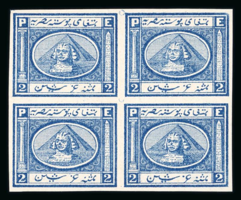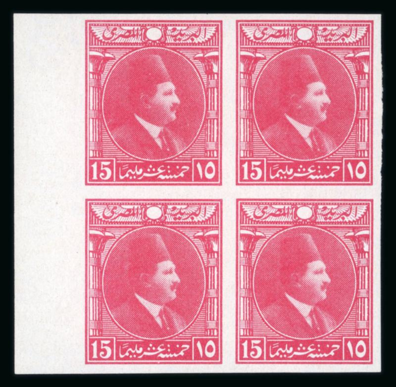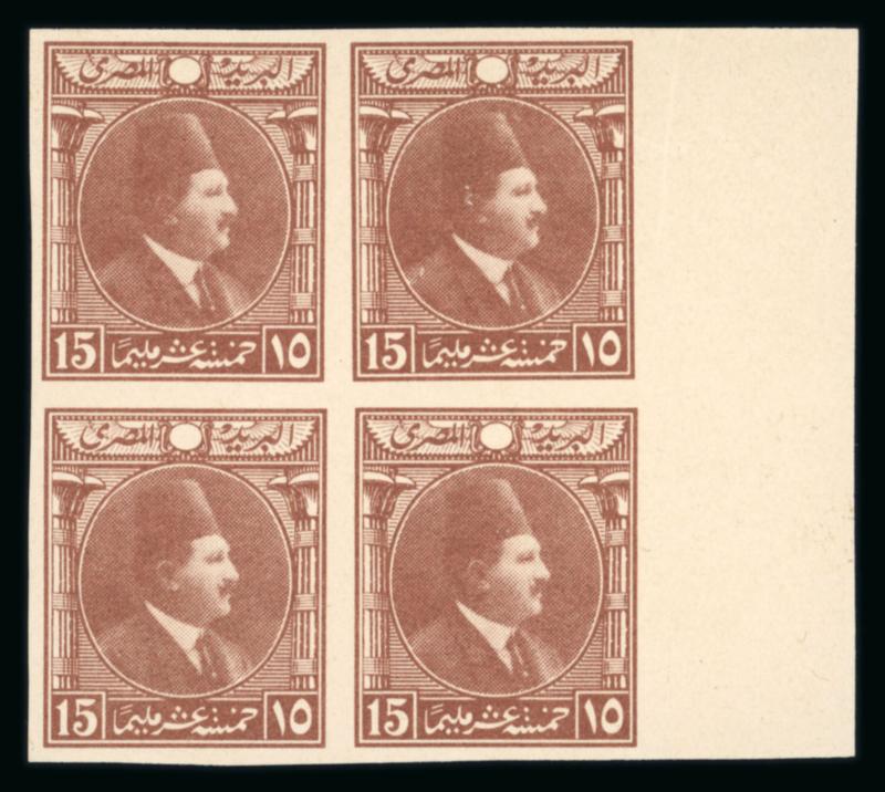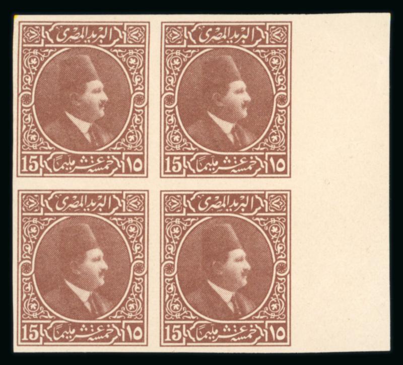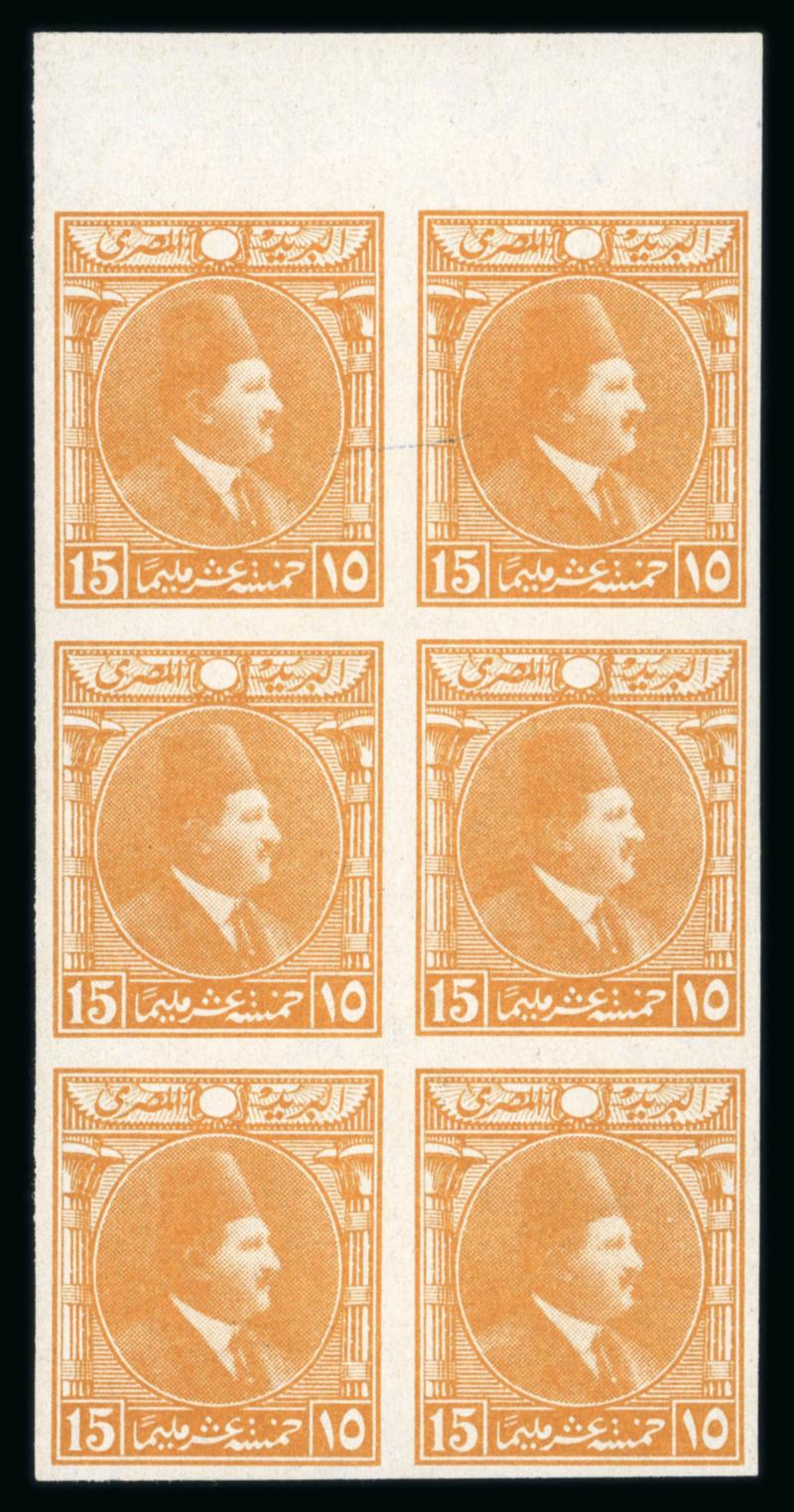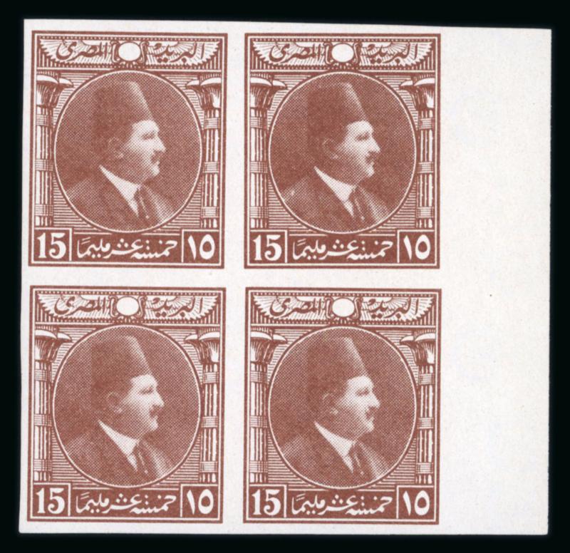 1922 Essays by the Survey Department of Egypt, Cairo: 15m Blue, small format, vignette depicting Fouad facing right, two different designs with lotus on the left and papyrus on the right, on ungummed thick paper in se-tenant sheetlet, very fine, and an extremely rare showpiece (NP E208, $1'250) (Image)