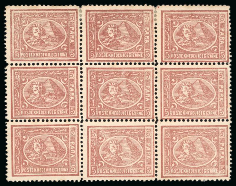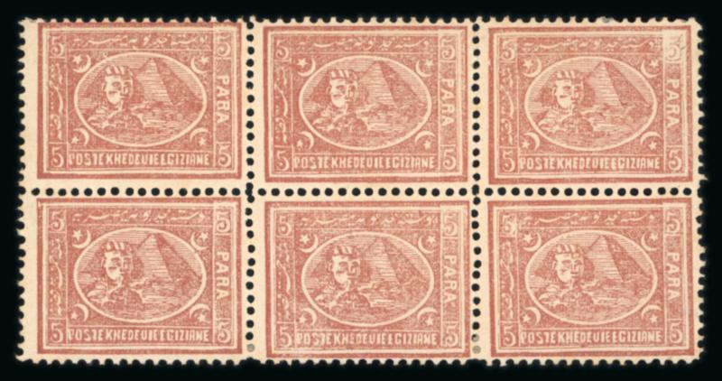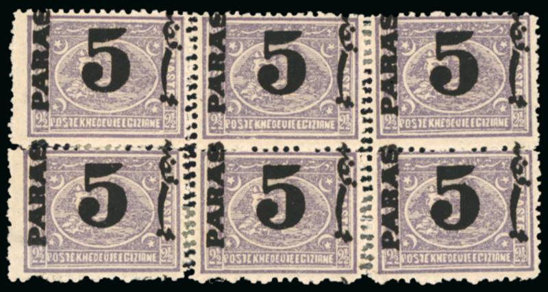 1879 Provisional Surcharge issue, 5pa on 2 1/2pi violet, perf. 12 1/2 x 13 1/3, block of six pos. 61-63, 71-73, a very interesting multiple displaying overprint types I, II, III and double perforation vertical in the two internal rows, mint with some hinges affixed for reinforcement, a very scarce multiple of fresh colour; cert. Charles Hass (1997). (Image)