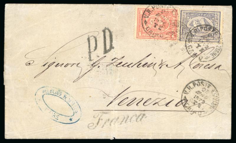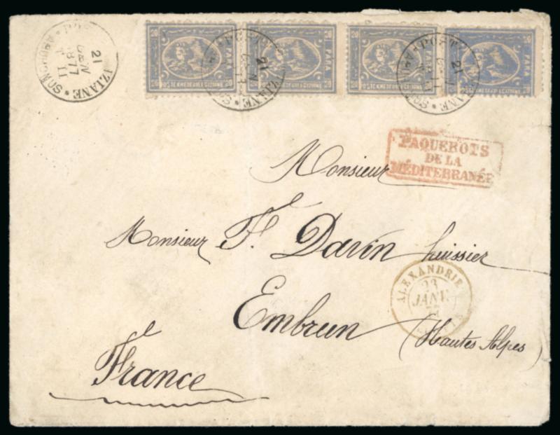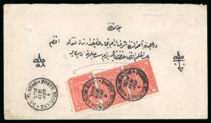 1pi. vermilion, vertical pair and single, neatly tied on 1877 (4.1) cover to Constantinople, by "POSTE EGIZIANE / UFFIZIO NATANTE / 4 GEN 1877 / ALES" Mailboat datestamp, with another strike alongside, backstamped on arrival in Constantinople, an important maritime showpiece, only two such covers are recorded; cert. RPS (1975); ex G. T. Houston.