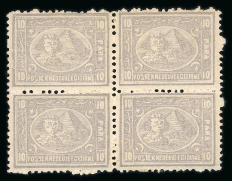 10pa Lilac, used block of four, cancelled on fragment by POSTE EGIZIANE/SUEZ cds, very fine and a very scarce used multiple. (Image)