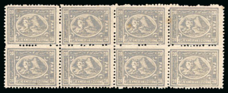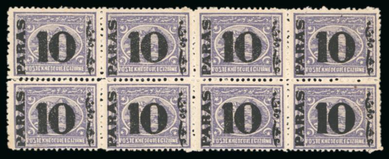 10pa. on 2 1/2pi. violet, perf. 12 1/2, mint horizontal block of eight, showing position 122 with broken "P" in "Para", some horizontal perf. separation, top left stamp creased, a few tone spots, fine, unusual, and a very scarce multiple with the error. (Image)
