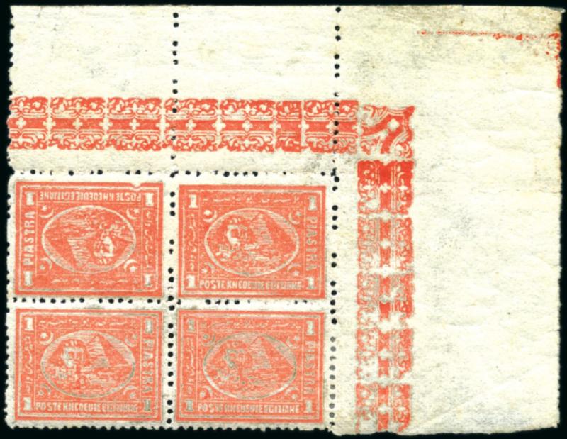 1pi scarlet, perf 12 1/2, mint and mint nh, top right corner sheet marginal block of four, showing tête-bêche and position 9 indented frameline, fresh, fine and scarce. (Image)
