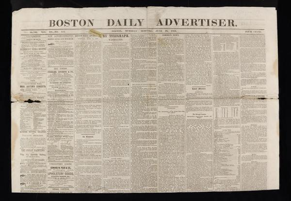 Boston Daily Advertiser, June 16, 1868 Issue with "Express X Petersburg VA" printed on cream colored label affixed, 4 pages of international, national and local news (including story on the settlement of lawsuits in Europe against agents of the Confederate government), local events (including performances of Uncle Tom's Cabin at the Boston Museum), shipping (including railroads, ships to foreign destinations for passengers and freight including Hong Kong, India, Australia, Honolulu, South America, etc., boats), auctions and other items for sale, court activities, financial records, etc. few small faults at sides barely affect text, otherwise Fine-Very Fine, the "Express X Petersburg VA". (Image)