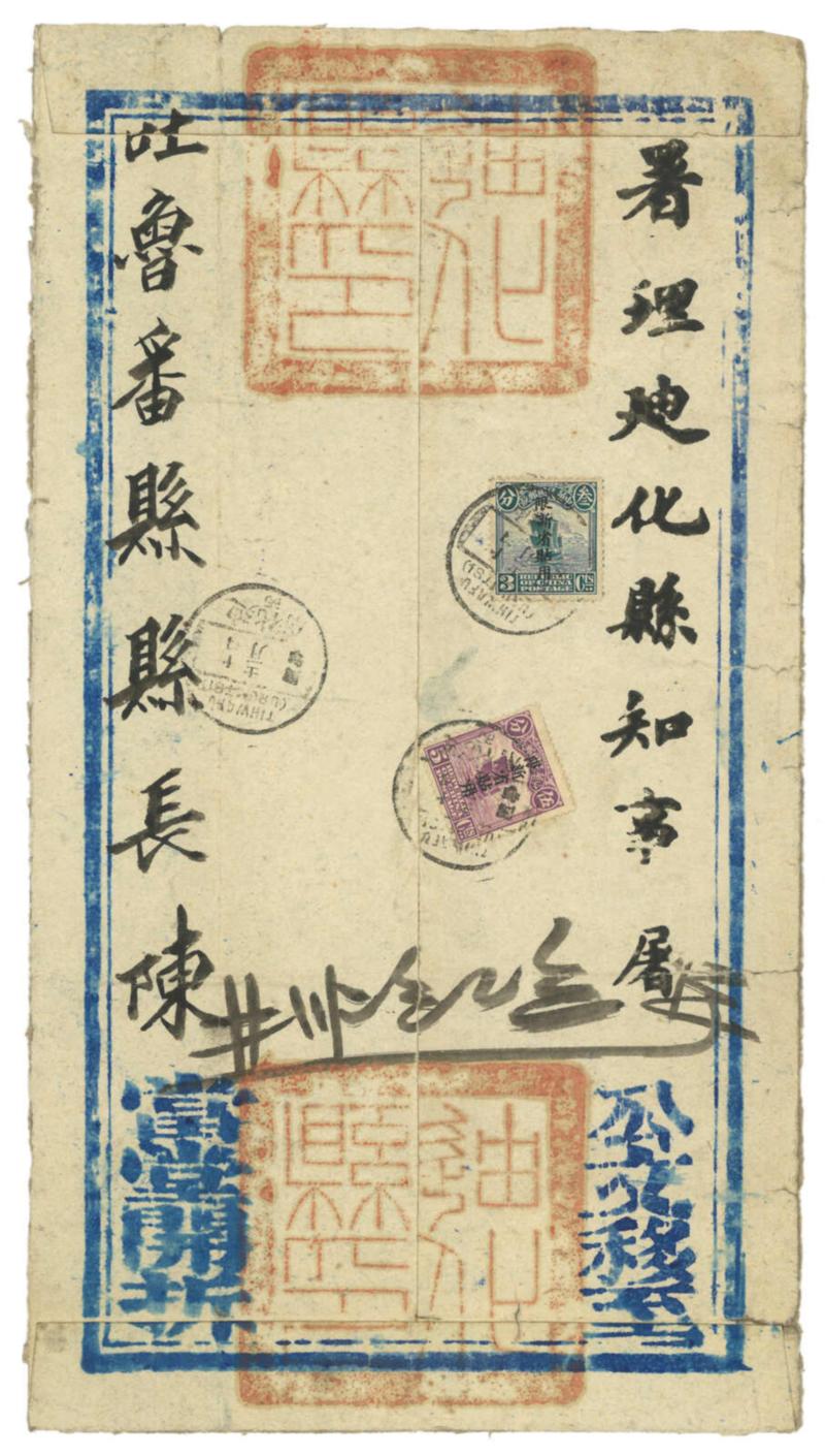 1917 Sinkiang Judiciary Organizing Committee from Tihwa (3 Jul) to Governor of Turfanhsien. Registered large official cover, f.w. Junk ovpt. Limited For Use in Sinkiang 3c + 8c, tied by TIhwafu bilingual cds. Arrived Turfan (6 Jul).