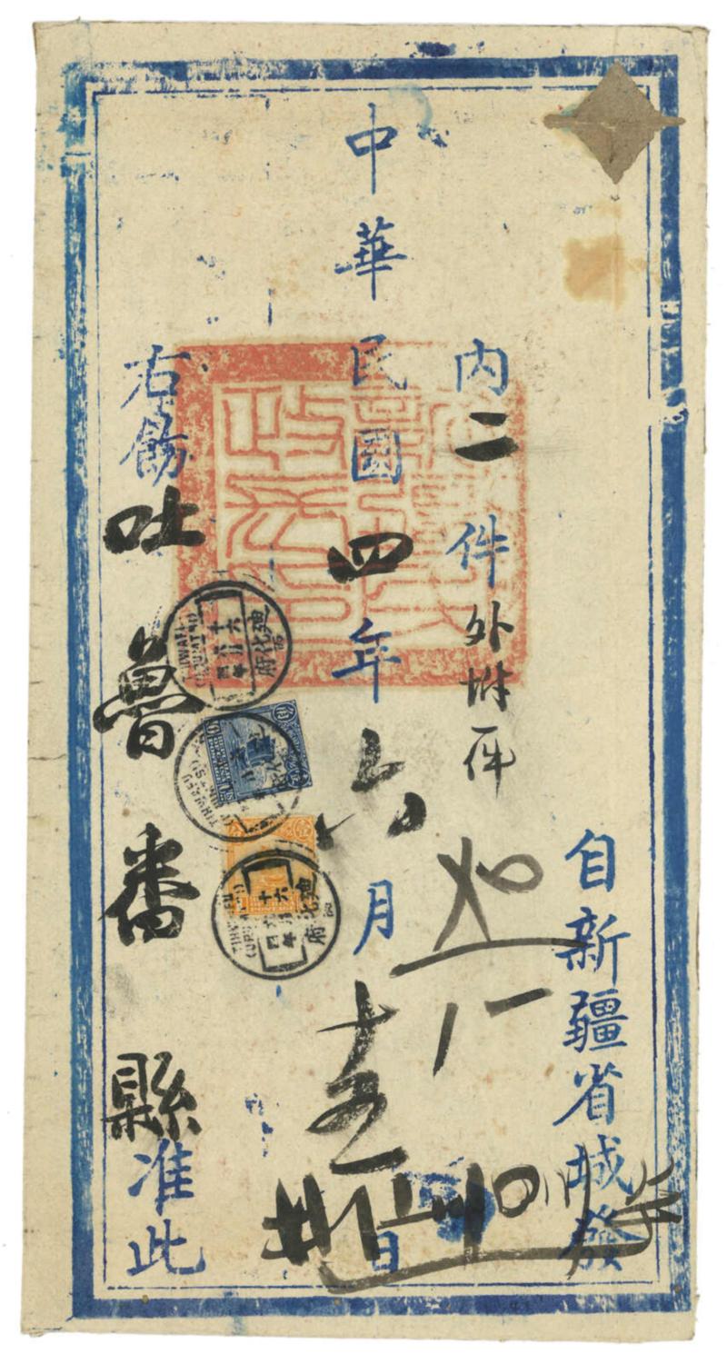 1915 Tihwa (14 Dec) to Turfan. Registered large official cover, f.w. Junk 1st ovpt. Limited For Use in Sinkiang (slanting head) 3c + 5c, tied by Tihwafu bilingual cds (date reading from left to right). Arrived Turfan (17 Dec).