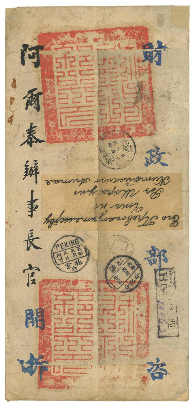 1916 Ministry of Finance, Peking (8 Aug) to Altay Amban via Siberia, f.w. Junk 10c in block but damaged on reverse, paying international rate, tied by Peking bilingual cds. Transit Manchouli (13 Aug), Manass (5 Apr). Arrived Altay (23 Apr). Altay became part of Sinkiang in 1919 after the independence of Mongolia.