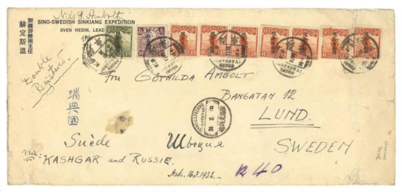 1932 Soche (20 Feb) to Sweden. Pre-printed Sven Hedin Expedition double-registered cover, f.w. Junk ovpt. Limited For Use in Sinkiang x9, in total of 90c, tied by Soche bilingual cds. Transit Ierhkoszetang (26 Feb). Arrived Lund. Mails via Ierhkoszetang are much more scrace than via Tahcheng. Illustration fig. 08-06 p.125 “The Postal History of Xinjiang (Sinkiang)” by Danny Wong and Xie Wei Jing.
