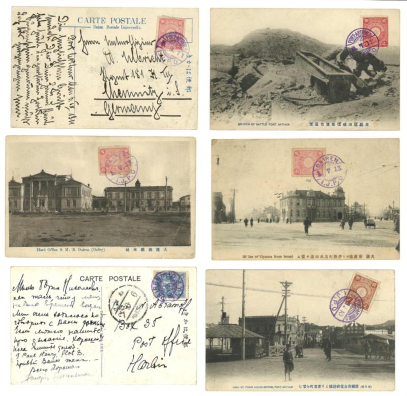 1900s a collection of 9 Japanese military covers and postcards used in Port Arthur, showcasing cancellations of 1st, 2nd, 5th, 7th FPO. A comprehensive collection.
