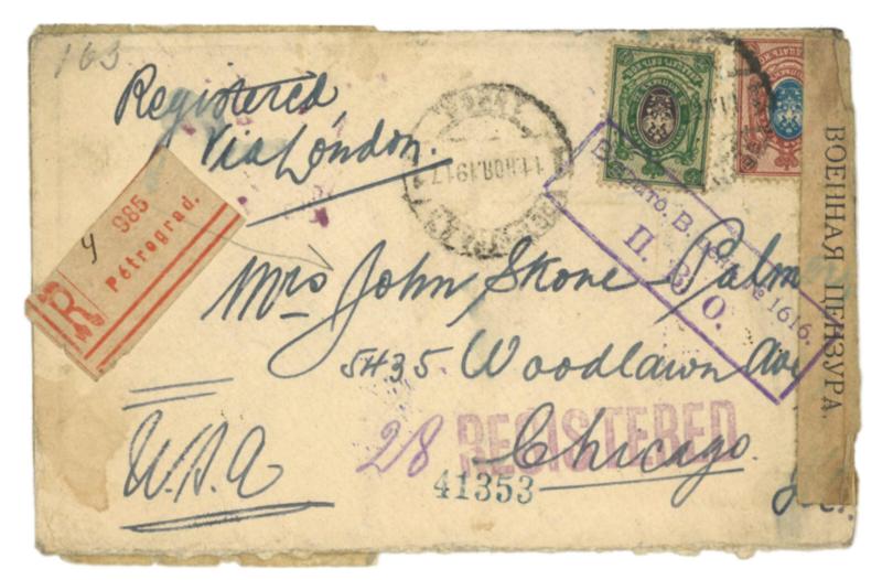1917 St. Petersburg (11 Dec) to USA. Reigstered cover, f.w. Russian Coat of Arms 15k + 25k, tied by St. Petersburg cds., alongside with registered label, Russian censor mark and label. Transit New York (1 Mar). Arrived Chicago (2 Mar). This cover was sent during Russian Civil War and before the end of WWI, taking 3 months to deliver.