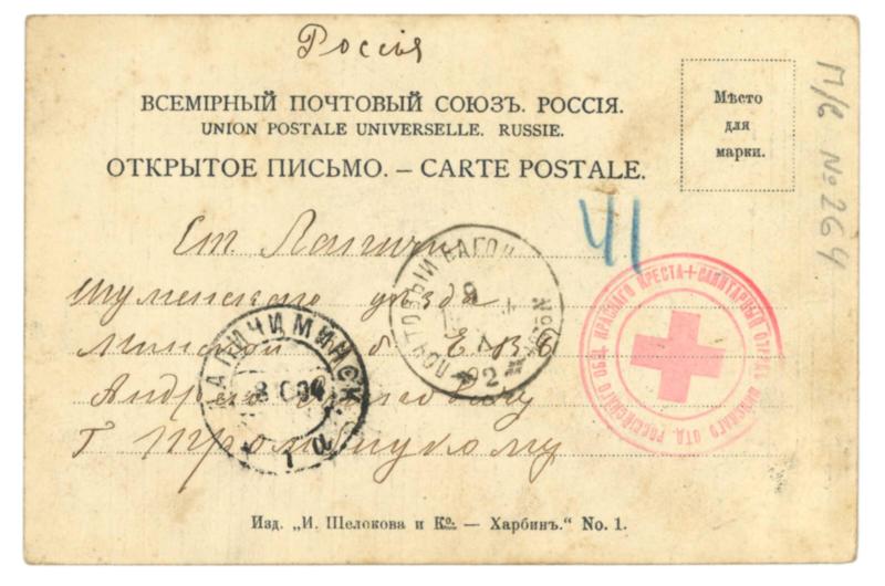 1918 Arkhangelsk (16 Jan) to Bombay via sea route. Russian 5k PSC, uprated by 3k ,tied by Arkhangelsk cds. Transit Shanghai (28 Apr), Dhanushkodi (1 Jun). Arrived Bombay (8 Jun). The card was sent during Russian Civil War and Trans-Siberian Railway was not available. Sea route was adopted from Arctic Ocean to Indian Ocean via Pacific Ocean. 5 months were spent.