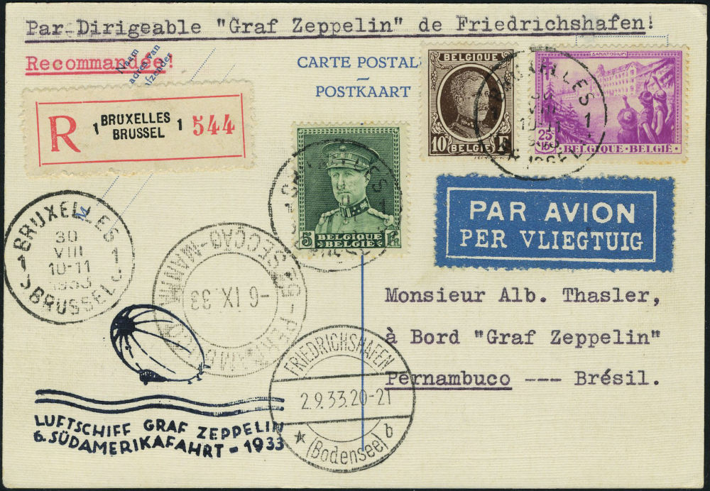 Zeppelin 6.SAF.1933, CP recommandée de Bruxelles 30.VIII.1933 pour Pernambuco, CàD de transit Friedrichshafen 2.9.33 - Arrivée Pernambuco 6.IX.33, TB (Image)