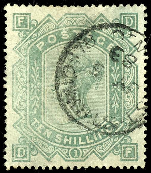 1882/83, 10 Shilling Victoria, Wz. Anker, auf weißem Papier, mit Einkreisstempel "LONDON STRAND JY 5 / 83", Eckzahn rechts unten verkürzt, sonst überdurchschnittlich gut gezähnt, Farbe teils etwas stärker verblasst, dennoch präsentables Stück der recht seltenen Marke, Mi. 2.500.- - ex Slg. "Dillaway" (Harmers Int. New York 2023) (SG-No. 135) (Image 1)(Image)