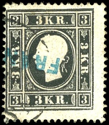3 Kreuzer Franz Joseph, schwarz, Type Ia, gestempelt mit blauem Zusatzstempel L1 "FRANK(O)" (Müller Nr. 3701a, 510 Punkte), tadellos, gepr. Rismondo, Mi. 420.- (Image 1)(Image)