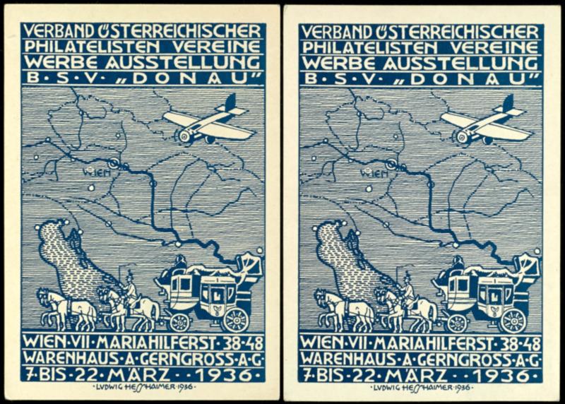 1936, 2 Ansichtskarten mit Motiv "BSV Donau" Flugzeug und Postkutsche über österreichischer Landkarte. Beide Karten blanko gestempelt mit Sonderstempel und grüner bzw. roter Vignette. (Image 1)(Image)