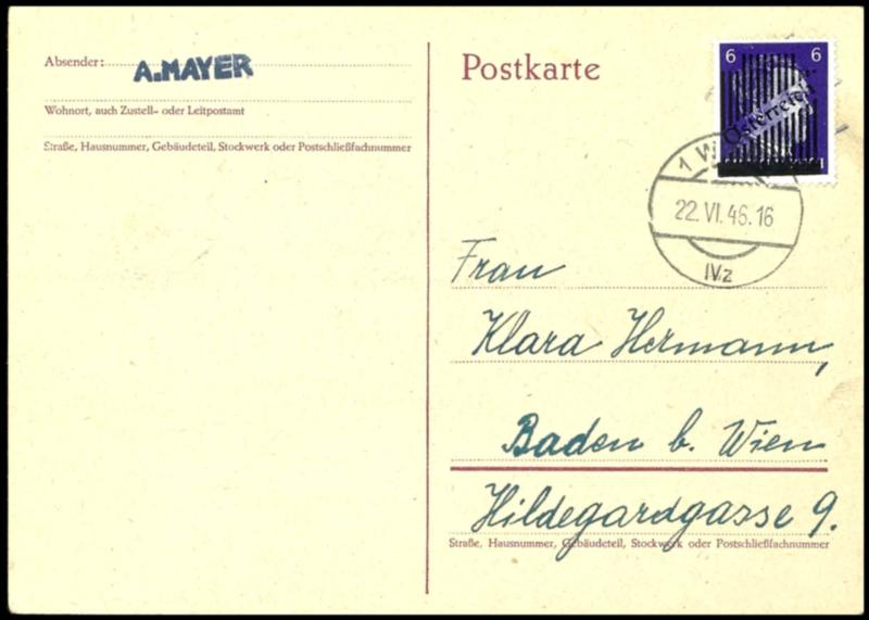 6 pfennigs Hitler with grid overprint, properly franked single franking on postcard from "Vienna 22. VI. 46" to Baden by Vienna, ANK 460.- (669)
