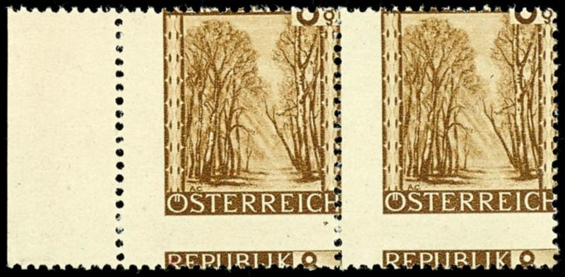 1945, 8 Groschen landscapes, variety "with defective or badly placed perforation", horizontal pair from left margin of sheet, mint never hinged, very fine. (742Abart)
