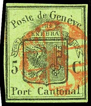 1845, 2 1/2 Rp black / white blue / carmine red 1st issue, so-called Basel Dove, cancelled by red dual circuit cancel "Basle", fresh colours clearly embossed stamp three sided slightly cut into respectively touched otherwise very fine, expertized Drahn, photo expertize Till Neumann BPP "despite the restrictions a fresh copy of the first edition of this popular rarity. ", Michel 14.000.- / Zumstein number 8 a (1a) Certificate