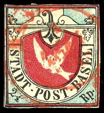 1845, 2 1/2 Rp. schwarz/weißblau/karminrot 1. Auflage, sogenannte Basler Taube, entwertet mit rotem Zweikreisstempel "BASEL", farbfrische sehr deutlich geprägte Marke dreiseitig leicht angeschnitten bzw. berührt sonst tadellose Erhaltung, geprüft Drahn, Fotoattest Till Neumann BPP "Trotz der Einschränkungen ein frisches Exemplar der ersten Auflage dieser beliebten Rarität.", Mi. 14.000.- / Zumstein Nr. 8a (Image 1)(Image)