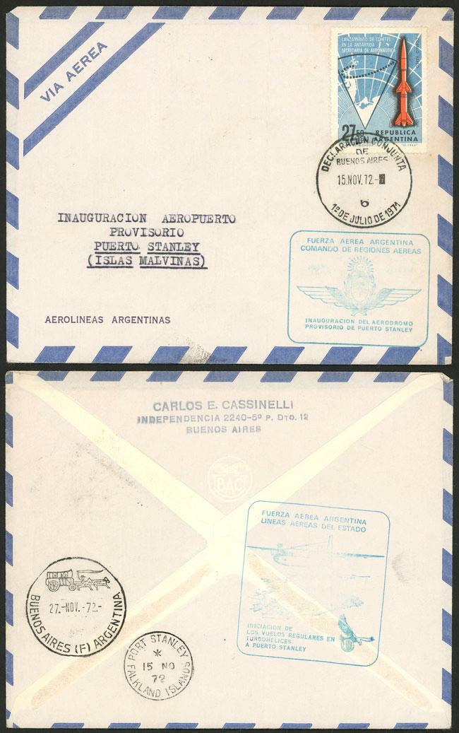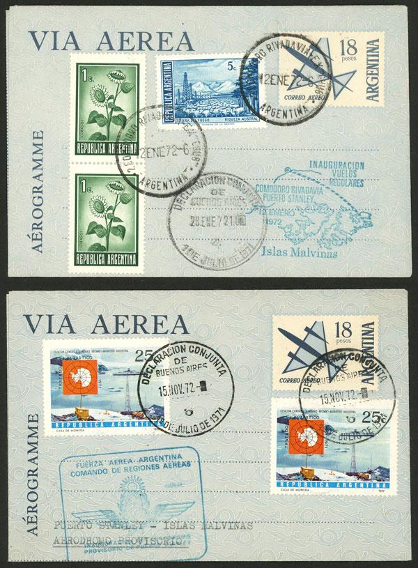 12/JA and 15/NO/1972, First flight of the regular service by LADE between Comodoro Rivadavia and Port Stanley and flight commemorating the inauguration of the provisional airfield in the Falkland Islands built by the Argentine Air Force, both with arrival mark of Port Stanley for the same day as the dispatching date, special handstamps and Declaración Conjunta, excellent quality! (Image)
