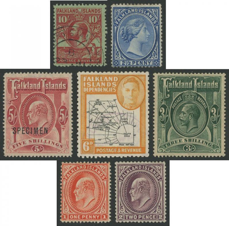 1890s-1970s collection from 1891 QV Crown CA Wmk extensive range of shades including 1d brown * & used, 1d claret used, 2½d dull blue unused & used, 2½d Prussian blue used and 6d orange-yellow (Wmk Reversed) *, 1904-12 KEVII Heads set * including 3/- green & 3/- deep green plus 3/- & 5/- 'SPECIMEN' overprints and extra shades 1d dull coppery-red * & used, 2d reddish-purple *, etc, 1912-20 KGV Multiple Crown CA Wmk 5/- reddish-maroon used and 1921-28 Script CA Wmk set * plus extra shades and 3/- 'SPECIMEN' overprint, 1929-37 KGV Whale & Penguin 4d deep orange, 5/-, 10/- & £1 used, 1935 KGV Silver Jubilee * & used, 1938-50 KGVI Pictorials set */** & used with extra shades including 1/- light blue *, 1/- greenish-blue **, 1/- dull blue used, 1/- deep dull blue (Thin Paper) used, 5/- indigo & pale yellow-brown * & used, 5/- steel blue & buff-brown *, 10/- black & orange-brown * and 10/- black & light orange ** plus unlisted shades of 9d, 2/6d & £1 *, 1948 Silver Wedding £1 mauve Plate Number ' 1 ' block of 4 **, 1952 KGVI Pictorials set ** & used (ex 1/3d) plus £1 blocks of 4 ** & used, 1955-57 QEII Pictorials set in blocks of 4 ** & used, 1960-66 Birds set used, 1968 Flowers & 1971 Decimal Surcharges sets in Plate Number blocks of 4 ** and other issues from the period with plenty of thematic interest, also Dependencies 1944-45 overprints on KGVI Pictorials sets **, 1946-49 Thick Map set in Plate Number ' 1A ' blocks of 4 ** and 6d black & ochre used plus Thin Map set used and in blocks of 4 **, 1954-62 Ships set **, South Georgia 1963 Pictorials set used, etc, condition a little variable a few of the earlies with minor blemishes/aging marks but generally fine to very fine, Cat £12,500+.