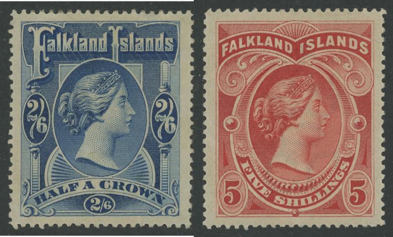 1898 QV High Values 2/6d deep blue & 5/- red SG 41 & 42, unusually well-centred for this issue, small hinge remainders, Cat £525. (2) (Image1)