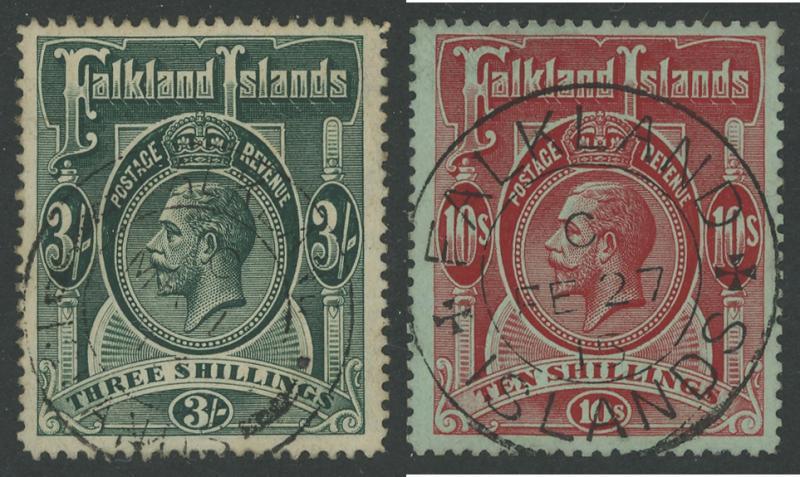 1912-20 KGV Heads Multiple Crown CA Watermark 3/- green & 10/- red/green SG 66 & 68, both well-centred with light central double-ring cds cancels, Cat £400. (2) (Image1)