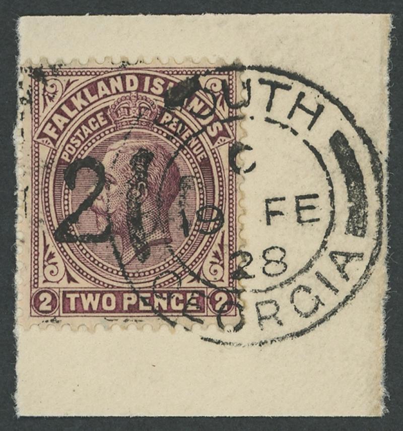1928 South Georgia Provisional '2½D' handstamp on KGV 2d purple-brown SG 115 tied to piece by largely very fine 'SOUTH/19 FE/28/GEORGIA' cds cancel, Cat £1500+ for used. BPA Certificate (1998) for a pair - this being the right-hand unit - and RPSL Certificate (photocopy) for the same pair endorsed "I have split the pair ... K Ceremuga 10/9/2007". (Image1)