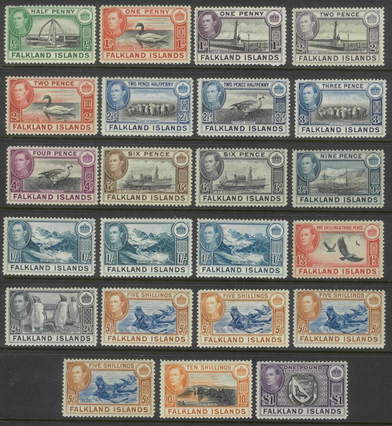 1938-50 KGVI Pictorials ½d to £1 set SG 146-163 plus extras including 1/- x3, 2/6d, 5/- x5, 10/- x2 & £1 in a range of shades, condition a little mixed with some aging marks, Cat £1750+ for the cheapest shades unmounted. An inexpensive opportunity to start a collection of the numerous printings & shades of this fascinating set.