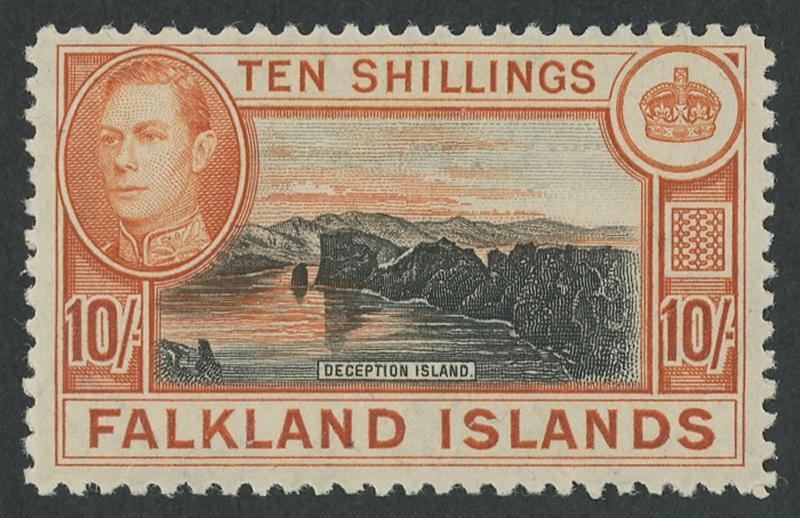 1938-50 KGVI Pictorials 10/- black & deep reddish-orange on Thin Paper SG 162b, unmounted, Cat £1000. (Image1)