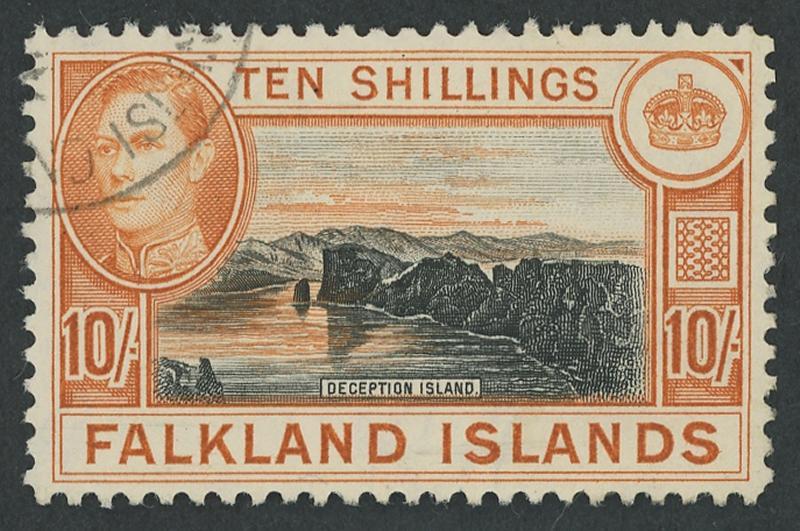 1938-50 KGVI Pictorials 10/- black & deep reddish-orange on Thin Paper SG 162b, well-centred, small-part single-ring cds corner cancel, Cat £800. (Image1)