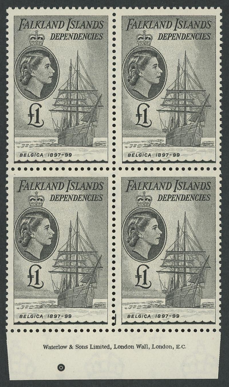 FALKLAND ISLANDS DEPENDENCIES: 1954-62 Ships ½d to to £1 set SG G26-40 in marginal Waterlow & Sons Imprint blocks of 4 from the base of the sheets, unmounted, Cat £900+ for singles.