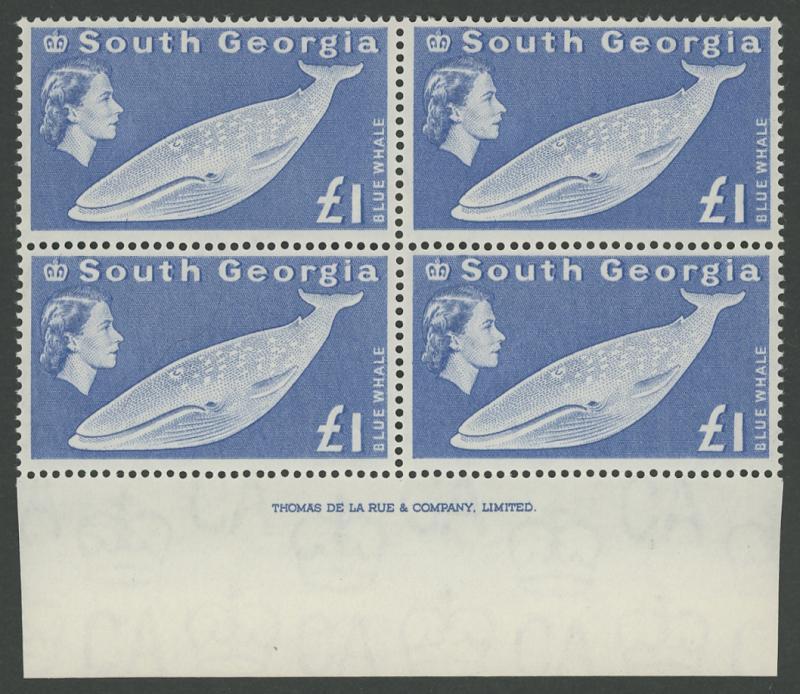 SOUTH GEORGIA: 1963-69 Pictorials ½d to to £1 ultramarine & £1 grey set SG 1-16 Thomas De la Rue Imprint blocks of 4 from the base of the sheets, unmounted, Cat £800+ for singles.
