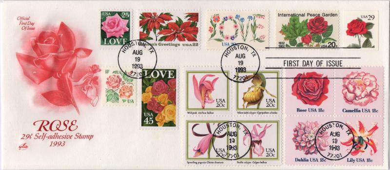 Business or larger size UA FDCs w/ various 1990s full booklet panes, gummed & self-adhesive, majority are House of Farnum cachets; also some other cachetmakers, one hand drawn, several event covers & a few combo cvrs; nice selection, little dup, (120) total; gen VF (Image)