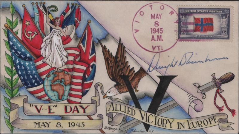 DOROTHY KNAPP #911 V-E Day colorful cachet w/ allegory & flags over globe (Weisz V-E 3) franked w/ #911 Norway flag, postmarked at Victory, VT; cover has been signed by Gen. Dwight D. Eisenhower in blue ink between cachet & stamp; vivid colors, flap marks on back o/w VF (Image)