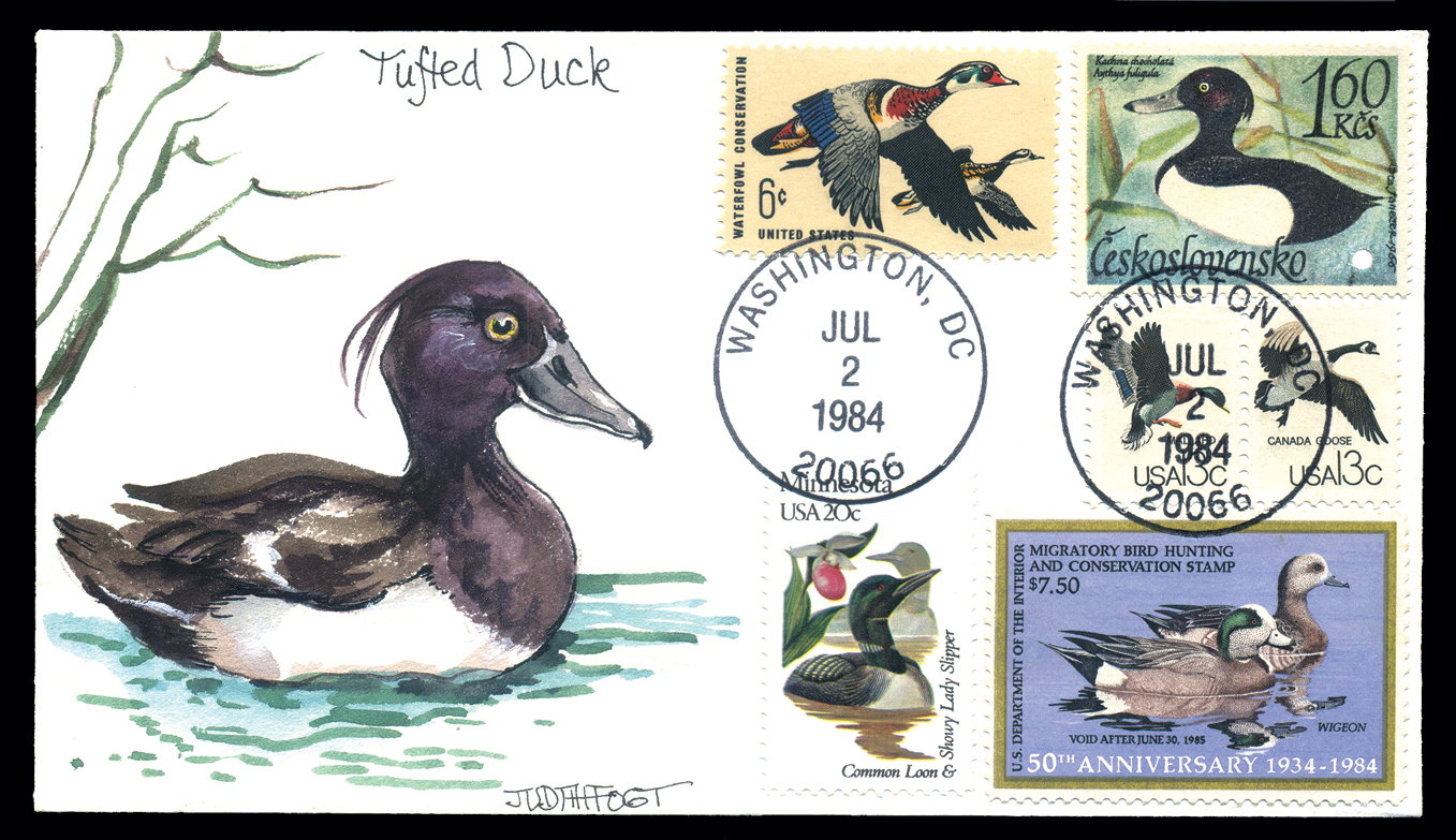 RW51,1984 Wigeon on FDC, in combination with no. 1362, 1975 and Czechoslovakia no. 1453, tied to cover by (2) cds "WASHINGTON, DC/JUL2/1984/20066", unaddressed, hand drawn/hand painted cachet by Judith Fogt, signed but not numbered (probably unique). Serviced by "RINGOLD STAMP COMPANY/ST. LOUIS, MISSOURI", hand stamp on reverse (Image)