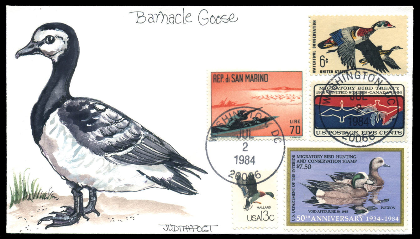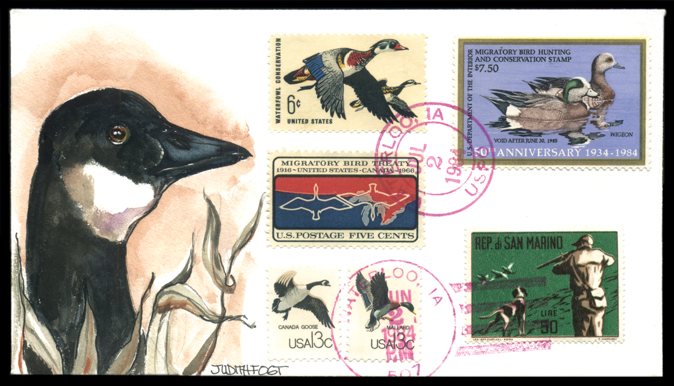 RW51,1984 Wigeon on FDC in combination with nos. 1306, 1362 and San Marino no. 535 (Wild Duck Hunt), unaddressed, hand drawn/hand painted Judith Fogt cachet, signed, not numbered (unique), stamps tied to cover by (2) postmarks; a double circle cds "Waterloo, IA/JUL/2/1984/USPO and cds "WATERLOO, IA/JUN/2/1984/P.M./507" (forgot to change the month in the canceling machine?). Unofficial FDC, serviced by "RINGOLD STAMP COMPANY/ST. LOUIS, MISSOURI" hand stamp on reverse and also pencil note (Image)