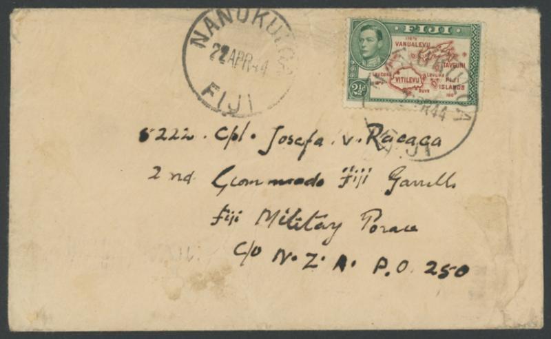 1944 (April 22) to "Cpl Josefa V. Racaca, 2nd Commando Fiji Guards, Fiji Military Force, c/o NZAPO 250" in the Solomon Islands with KGVI Pictorials 2½d Map tied by 'NANUKULOA/FIJI' cds, Suva '24 MAY/1944' machine backstamp, minor blemishes. Very scarce inwards mail to the Fijian Forces in the Solomon Islands, of which only three examples are recorded. Ex Stan Jersey. (Image1)