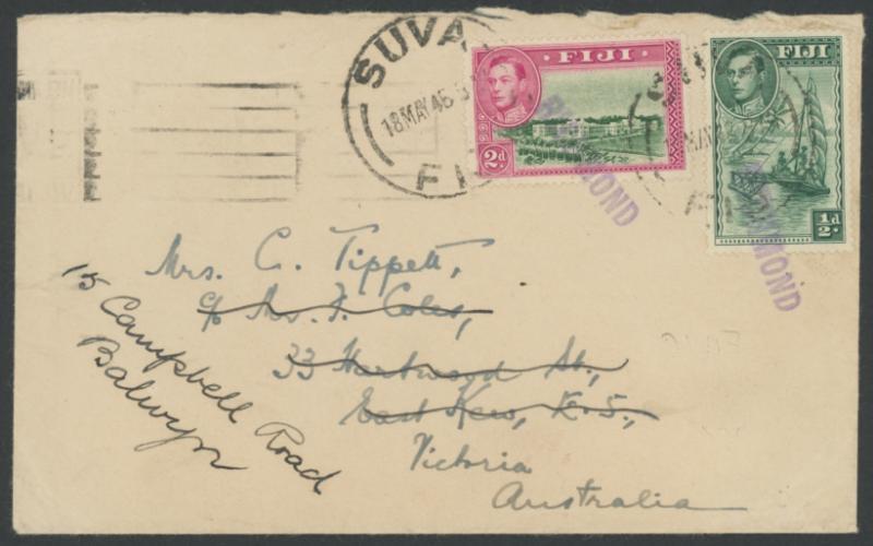1946 (March 18) to Australia with KGVI Pictorials ½d & 2d tied by two largely very fine complete strikes of 'RICHMOND' single-line village rubber handstamp in violet lightly overstruck by Suva transit cds, Melbourne '4 JNE/1946' machine backstamp, a couple of minor blemishes. (Image1)