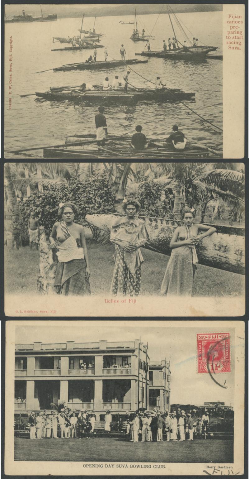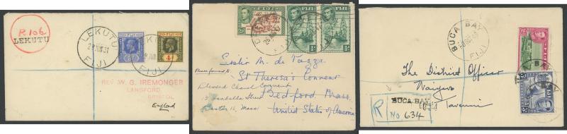Pre-WWII mostly commercial covers including 1895 front to NSW, early Postal Cards to Germany x2, France or Isle of Wight (message headed "HMS Pylades Suva" refers to a cricket match - "We got horribly beaten" - carried per Naval Bag & cancelled at London, corner fault), a few registered including two from Levuka (one commercial to Victoria) and 1914 to Surrey paid 1d only but not taxed, destinations include Hawaii x2 (one taxed with US postage dues), Canada, Belgium, Tasmania and British Guiana, a few Paquebot items including 1923 advertising cover from Auckland to Canada with NZ stamps tied by 'GPO SUVA' cds (stained), etc, postmarks include commercial covers with 'MAKOGAI' (apparently from a missionary at the leper colony), 'PO NADI', 'NAUSORI PO', 'PO NAUSORI' and 'SAVU SAVU EAST', a few problems but generally fine to very fine.