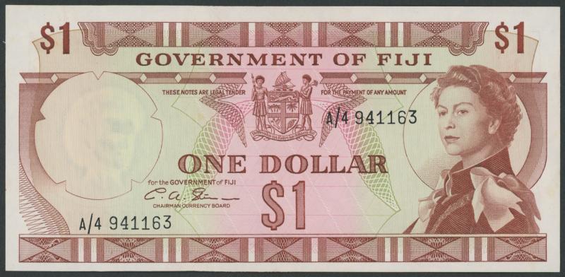 Group comprising 1942 Emergency Issue 1/- and 2/- remainders, P48r1 & P50r1, (Unc), 1968 $10 Ritchie/Barnes P62a (circulated, corner tear, scarce), 1971 $1 Stinson P65b (Unc), and 2007 $5 Narube P110a consecutive run of eight (Unc).