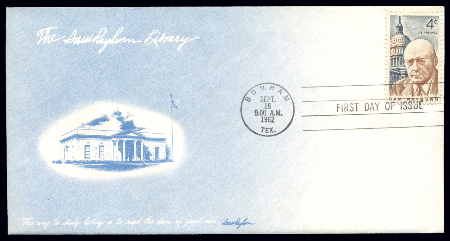1202,4¢ Sam Rayburn on FDC, XF, with first Sam Rayburn Foundation cachet (Mell. #1202-25), unaddressed with stuffer Cat($10) (Image)