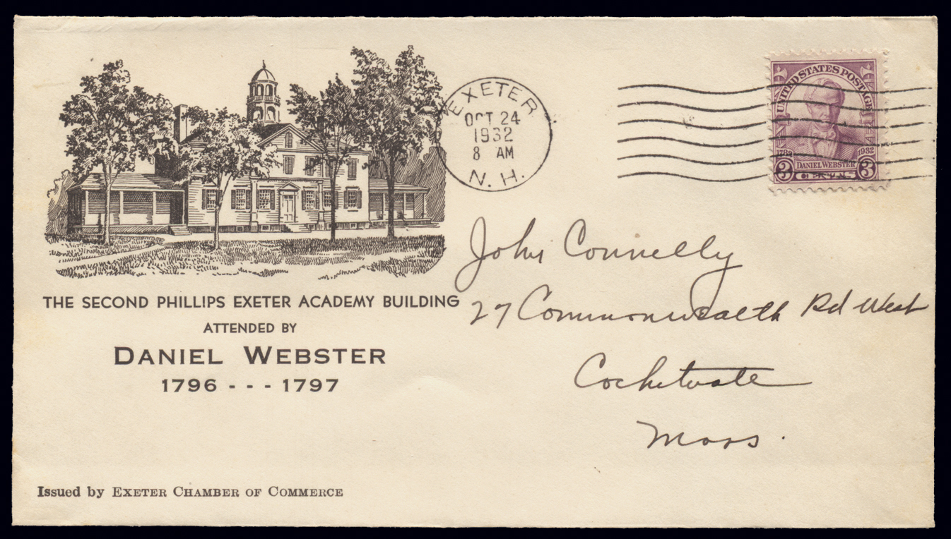 725,3¢ Daniel Webster on FDC, F-VF, with Exeter, NH FDOI ccl and with First Exeter Chamber of Commerce cachet (Mell. #725-24), ms address, clean and nice! (Image)