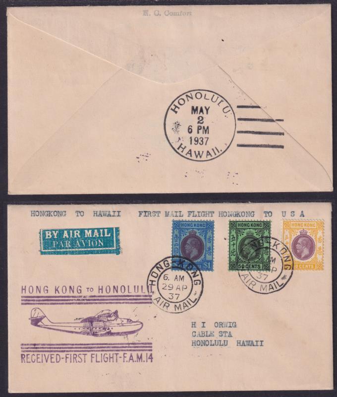 Hong Kong 1937 plain cover, neat typed address to Honolulu bearing 30c, 50c & $1 GV & purple received first flight cachet on front & 2 May arrival b/s. (Image)