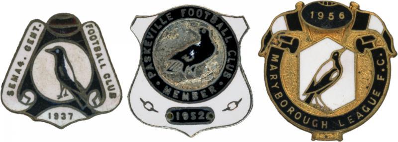Badges 1937-2007 collection of "Magpie" football badges, comprising Booborowie; Castlemaine 1965; Central Broken Hill (4) - 1962, 1964, 1967 & 1976; City 1958; Glenorchy (3) - 1969 Vice President, 1980 & 2007; Kilburn Life Member; Konoorong 1967; Maryborough 1956; Paskeville 1952; Port Neill 1967; Salisbury (2) - 1963 & 1984; Scoresby 1976; Semaphore (5) - 1937, 1951, 1961, 1965 & 1974; Sherwood Districts 1976, mainly Fine/Very Fine.