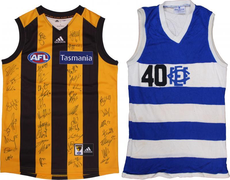 Football jumpers Hawthorn jumper with 40 signatures; Essendon 2005 Anzac Day jumper with number '35'; East Fremantle jumper with number '40'; OM (Ovens & Murray League?) jumper with number '4, mainly Fair/Fine.