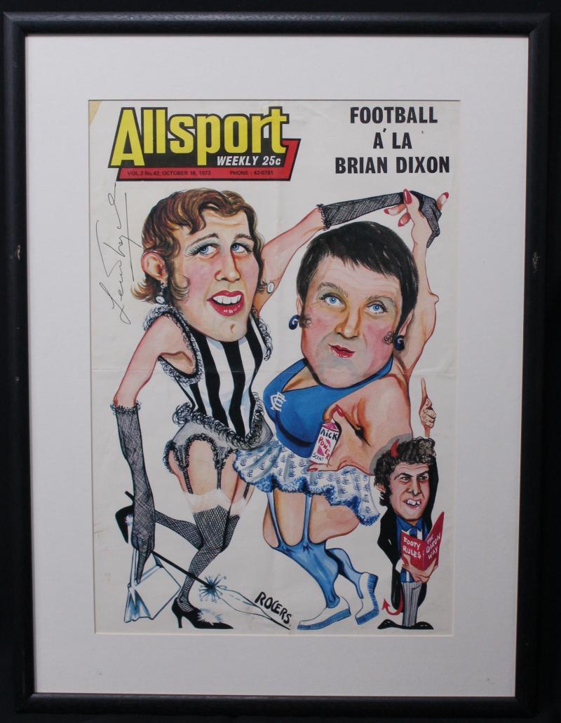Magazines 1963-64 'Footy Fan' (36) almost complete run plus some spares; 1972-74 'Allsport Weekly' (114) some duplication; framed Rogers poster signed by Len Thompson; other magazines (6), mainly Fair/Fine.