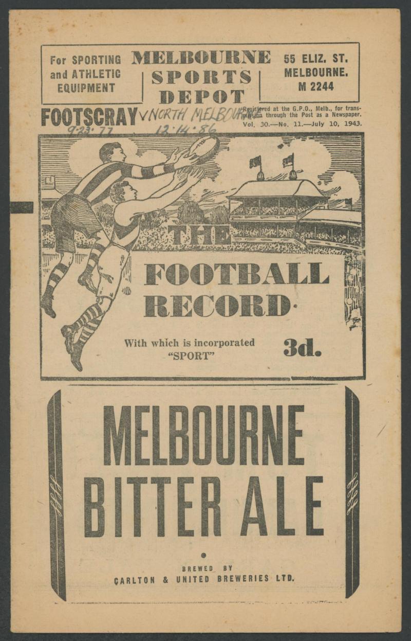 Records 1943-97 range with album of day matches & album of night matches, includes 1943, 1945, 1946 (2), 1948, 1949 (2); few scarce Pre-Season; WA Football Budget (8); SA Football Budget (12); VFA Football Recorder (10); cricket 1971 Centenary SA v Victoria, mainly Fair/Fine.